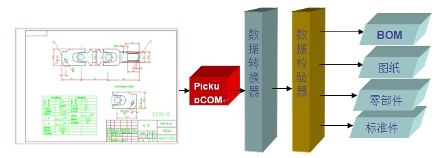 ? ? ? 原AutoCAD圖紙的歸檔和數據提取是一直困擾企業(yè)信息化實施過程中的一個問題?!惫埠谩痹谶@方面有非常好的表現,我們提供了一個獨立于AutoCAD和PLM系統(tǒng)的PickUpCom組件,通過PLM調用該組件自動提取AutoCAD圖紙中的歸檔信息(如圖號、名稱等)及產品結構數據(裝配圖的明細表信息)。
