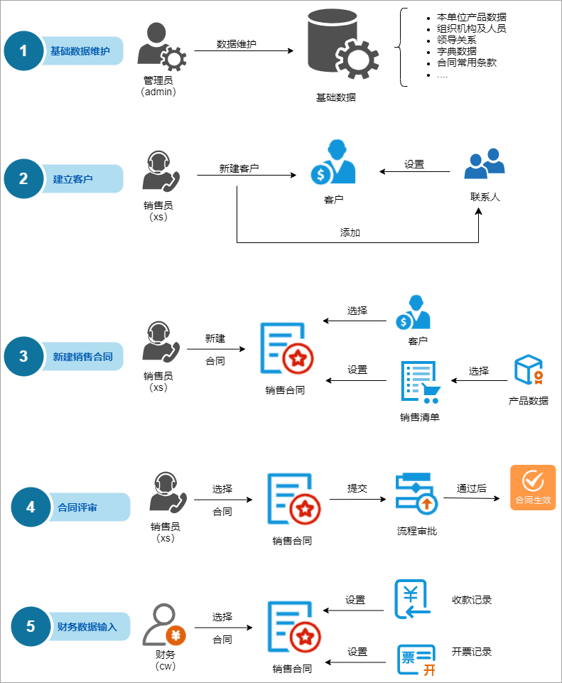 合同軟件涉及的企業(yè)員工角色:銷(xiāo)售、采購(gòu)、管理員、主管、財(cái)務(wù)。以下是各個(gè)角色主要需要做的事情。