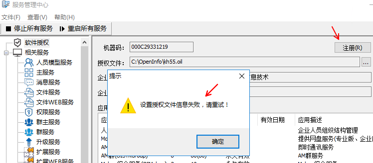 1、在注冊(cè)的時(shí)候,出現(xiàn)《設(shè)置授權(quán)文件信息失敗,請(qǐng)重試!》