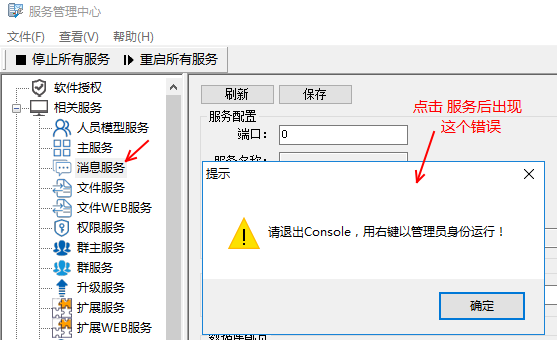 2、點(diǎn)擊服務(wù)的時(shí)候,出現(xiàn)《請(qǐng)退出Console,用右鍵以管理員身份運(yùn)行》