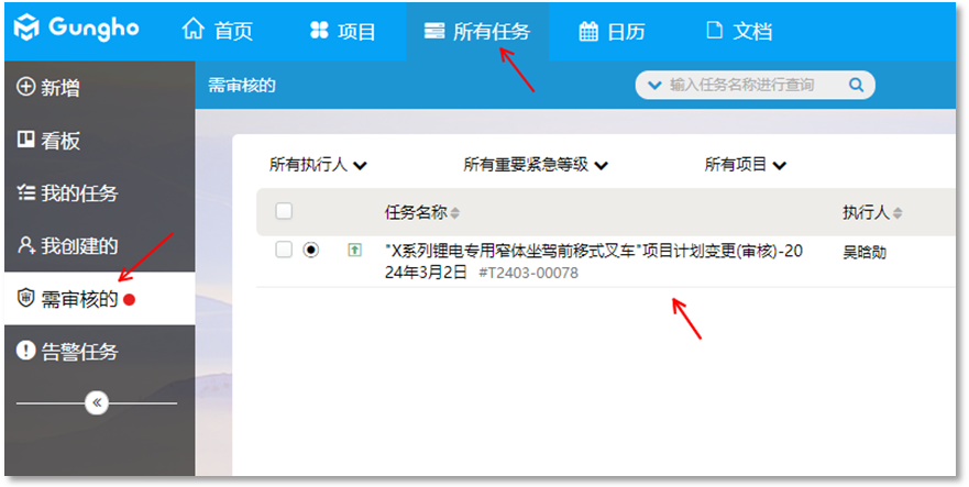 相關人收到審批需求的時候,會在審批人的“需審批的”任務里面列出