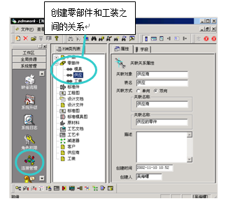 ? ? ? 當設計人員完成了一個零部件的設計后,其它管理人員可以在”共好”上完善該零部件和工裝等管理信息之間的關聯關系,見下圖: