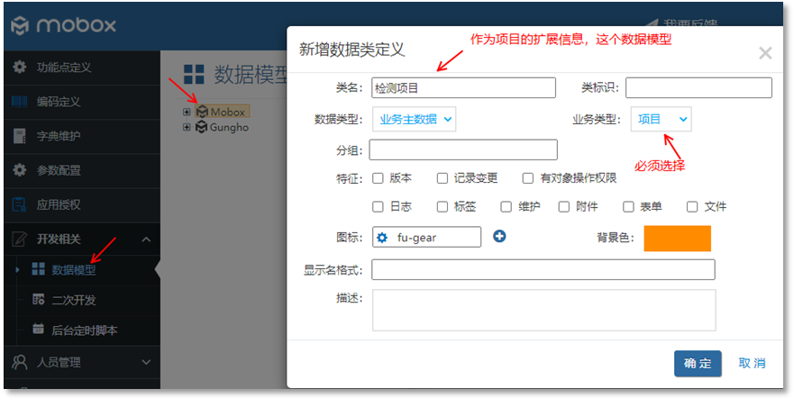 因為,我們是為Gungho的項目管理做配套,所以在mobox建立數據模型的時候,有類型需要選擇? ,業務類型必須是 “項目”