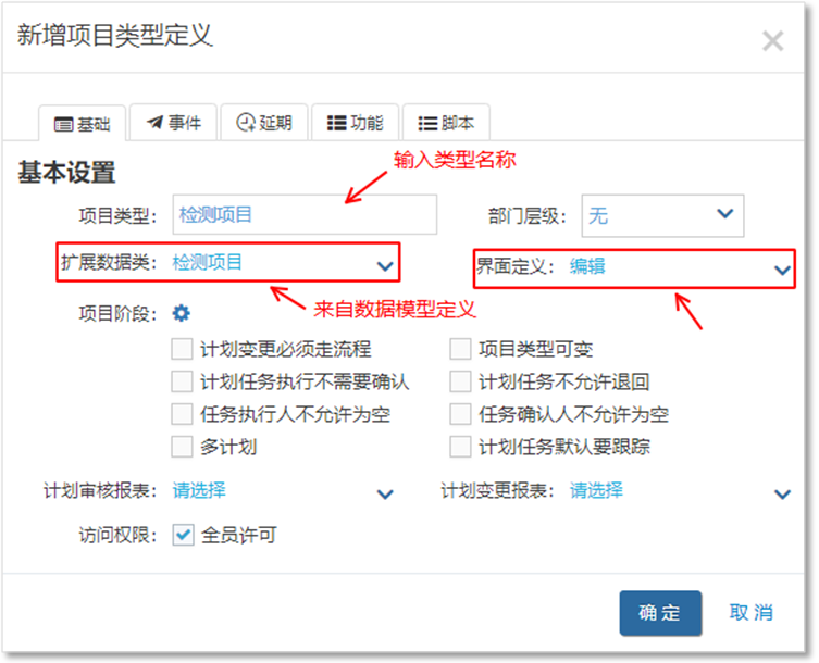 企業在實施項目管理系統的時候,不通類型的項目其屬性可能是不一樣的。而Gungho標準系統內對項目的屬性,主要包括(項目名稱、編號、開始結束日期等)。為了適應企業個性項目信息的輸入,我們需要通過Mobox平臺定義項目類型去適應這個需求